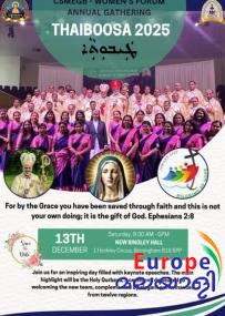 ബിര്മിംഗ്ഹാം. ഗ്രേറ്റ് ബ്രിട്ടന് സീറോ മലബാര് രൂപത വിമന്സ് ഫോറം ദേശീയ കണ്വെന്ഷന് ഈ ശനിയാഴ്ച( ഡിസംബര് 13 ) ബര്മിംഗ്ഹാമിലെ ന്യൂ ബിങ്ലി ഹാളില് നടക്കും ,രൂപതയിലെ മുഴുവന് ഇടവക /മിഷന് /പ്രൊപ്പോസഡ് മിഷന് കേന്ദ്രങ്ങളില് നിന്നും ഉള്ള വനിതാ പ്രതിനിധികള് സമ്മേളനത്തില് പങ്കെടുക്കും .രാവിലെ 8 .30 ന് രെജിസ്ട്രേഷന് നടപടികളോടെ ആരംഭിക്കുന്ന സമ്മേളനം രൂപതാധ്യക്ഷന് മാര് ജോസഫ് സ്രാമ്പിക്കല് ഉത്ഘാടനം ചെയ്യും വിമന്സ് ഫോറം രൂപതാ പ്രസിഡന്റ് ശ്രീമതി ട്വിങ്കിള് റെയ്സണ് . അധ്യക്ഷത വഹിക്കും .തുടര്ന്ന് നടക്കുന്ന സിമ്പോസിയത്തില് രൂപതാ പ്രോട്ടോ സിഞ്ചെല്ലൂസ് റെവ ഡോ ആന്റണി ചുണ്ടെലിക്കാട്ട് , വിമന്സ് ഫോറം കമ്മീഷന് ചെയര്മാന് റെവ ഫാ ജോസ് അഞ്ചാനിക്കല് ,ഡയറക്ടര് റെവ സി ജീന് മാത്യു എസ് എച്ച് , ശ്രീമതി ജോളി മാത്യു ,ഡോ ഷിന്സി മാത്യു ,ശ്രീമതി മെര്ലിന് മാത്യു എന്നിവരും സംസാരിക്കും , ശ്രീമതി ഡിംപിള് വര്ഗീസ് സ്വാഗതവും ഷീജാ ജേക്കബ് നന്ദി പ്രകാശനവും നടത്തും . സമ്മേളനത്തിന് ശേഷം അഭിവന്ദ്യ പിതാവിന്റെ കാര്മികത്വത്തില് വിശുദ്ധ കുര്ബാന അര്പ്പണം നടക്കും , സമ്മേളനത്തോടനുബന്ധിച്ച് വിമന്സ് ഫോറത്തിന്റെ പ്രവര്ത്തനങ്ങള് ഉള്ക്കൊള്ളിച്ചുകൊണ്ട് പ്രസിദ്ധീകരിക്കുന്ന സുവനീര് പ്രകാശനം , വിവിധ മത്സരങ്ങളില് സമ്മാനാര്ഹര് ആയവര്ക്കുള്ള സമ്മാന ദാനം ,പുതിയ ഭാരവാഹികളുടെ സ്ഥാനമേക്കല് ചടങ്ങ് , വിവിധ റീജിയനുകളില് നിന്നുള്ള കലാപരിപാടികള് എന്നിവയും നടക്കും , വിമന്സ് ഫോറം കമ്മീഷന് ചെയര്മാന് റെവ ഫാ ജോസ് അഞ്ചാനിക്കലിന്റെ നേതൃത്വത്തില് ഡയറക്ടര് റെവ ഡോ സി ജീന് മരിയ എസ് എച്ച് , ട്വിങ്കിള് റെയ്സണ് അല്ഫോന്സാ കുരിയന് ഡിംപിള് വര്ഗീസ് ,ഷീജാ ജേക്കബ് ,ഡോളി ജോസി എന്നിവരുടെ നേതൃത്വത്തില് ഉള്ള വിവിധ കമ്മറ്റികള് പരിപാടികള്ക്ക് നേതൃത്വം വഹിക്കും .