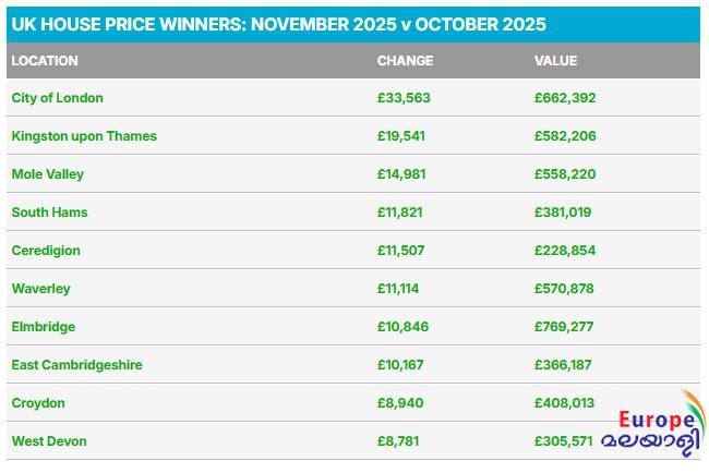 ഒക്ടോബര് മാസത്തിലെ നിരക്കുമായി താരതമ്യം ചെയ്യുമ്പോള് 0.3 ശതമാനമാണ് വര്ദ്ധന. എന്നാല് പ്രാദേശിക തലത്തില് ഇതില് വലിയ വ്യത്യാസങ്ങള് ഉണ്ടായിട്ടുണ്ടെന്ന് എസ്റ്റേറ്റ് ഏജന്റ് പര്പ്പിള് ബ്രിക്സ് പറയുന്നു. സൗത്ത് ഈസ്റ്റ് ഇംഗ്ലണ്ടിലാണ് ഏറ്റവും വലിയ തിരിച്ചടി നേരിട്ടത്. ഒരു മാസത്തിനിടെ 0.8 ശതമാനമാണ് ഇവിടെ ശരാശരി പ്രോപ്പര്ട്ടി വില ഇടിഞ്ഞത്. ഇപ്പോള് 381,369 പൗണ്ടാണ് ശരാശരി വില.