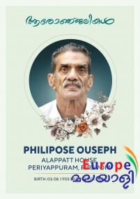 വില്ഷെയര് മലയാളി അസോസിയേഷന്റെ മുന് സെക്രട്ടറി പ്രദീഷ് ഫിലിപ്പിന്റെ പിതാവ് ഫിലിപ്പോസ് ഔസേപ്പ് നാട്ടില് മരണമടഞ്ഞു. 71 വയസായിരുന്നു.പിറവത്തെ ആദ്യകാല റബ്ബര് വ്യാപാരിയായിരുന്നു.