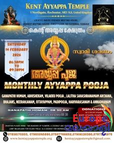 ഇംഗ്ലണ്ടിലെ കെന്റ് അയ്യപ്പ ക്ഷേത്രത്തില് കുംഭ മാസ പൂജ (2026 ഫെബ്രുവരി 14 ആം തീയതി ശനിയാഴ്ച) നടക്കും. അന്നേ ദിവസം രാവിലെ 8:30 ന് ഗണപതി ഹോമം, വൈകുന്നേരം 6 മുതല് അഭിഷേകം, ദീപാരാധന, വിളക്ക് പൂജ, ലളിത സഹസ്ര നാമ അര്ച്ചന, ഭജന, നീരാഞ്ജനം, പടിപൂജ, ഹരിവരാസനം എന്നിവ നടത്തപ്പെടുന്നതാണ്, വിളക്ക് പൂജയില് പങ്കെടുക്കുന്ന ഭക്തര് രണ്ടു ബഞ്ച് പൂക്കളും, ഒരു നിലവിളക്കും, നീരാഞ്ചനത്തിന് ഒരു നാളികേരവും കൊണ്ട് വരേണ്ടതാണ്.ക്ഷേത്രം മേല്ശാന്തി ശ്രീ അഭിജിത്ത് തിരുമേനിയും, താഴൂര് മന ശ്രീ ഹരിനാരായണന് നമ്പിടിശ്വരറും,പൂജകള്ക്ക് കാര്മികത്വം വഹിക്കും, വെള്ളിയോട്ടില്ലം ശ്രീ അദ്രിത് വാസുദേവ് പൂജകള്ക്ക് സഹ കര്മികത്വം വഹിക്കും