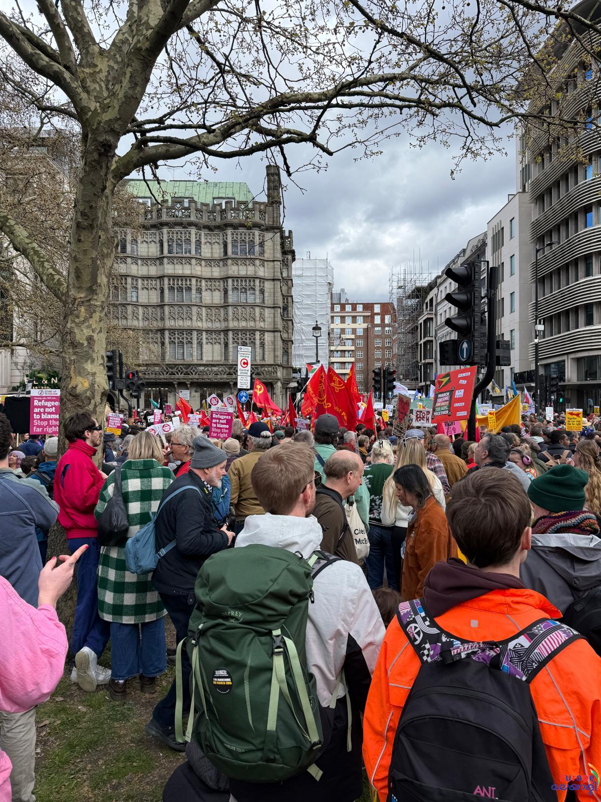 'ടുഗെതര്‍ അലയന്‍സ്' സംഘടിപ്പിച്ച പ്രക്ഷോഭത്തില്‍ പാര്‍ക്ക് ലെയിനില്‍ നിന്ന് ട്രാഫല്‍ഗര്‍ സ്‌ക്വയറിലേക്കായിരുന്നു പ്രതിഷേധ മാര്‍ച്ച്. വംശീയത, തീവ്രവലതുപക്ഷ രാഷ്ട്രീയം, കുടിയേറ്റവിരുദ്ധ നിലപാടുകള്‍ എന്നിവയ്‌ക്കെതിരെ ശക്തമായ പ്രതിഷേധം മാര്‍ച്ചില്‍ ഉയര്‍ന്നു. റാലിയില്‍ അഞ്ചു ലക്ഷത്തോളം പേര്‍ പങ്കെടുത്തതായി സംഘാടകര്‍ അവകാശപ്പെട്ടു.