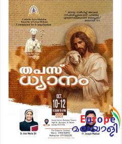 കേംബ്രിഡ്ജ്: ഗ്രെയ്റ്റ് ബ്രിട്ടന്‍ സീറോമലബാര്‍ എപ്പാര്‍ക്കി ഇവാഞ്ചലൈസേഷന്‍ കമ്മീഷന്റെ നേതൃത്വത്തില്‍ 'തപസ് ധ്യാനം' ഒക്ടോബര്‍ 10 മുതല്‍ 12 വരെ തീയതികളിലായി സെന്റ് നിയോട്ട്‌സില്‍ വെച്ച് സംഘടിപ്പിക്കുന്നു. ലണ്ടന്‍ റീജണല്‍ ഇവാഞ്ചലൈസേഷന്‍ ഡയറക്ടറും, പ്രശസ്ത ധ്യാനഗുരുവുമായ ഫാ. ജോസഫ് മുക്കാട്ട്, ഇവാഞ്ചലൈസേഷന്‍ കമ്മീഷന്‍ ചെയര്‍ പേഴ്‌സണും, കൗണ്‍സിലറും, പ്രശസ്ത തിരുവചന പ്രഘോഷകയുമായ സിസ്റ്റര്‍ ആന്‍ മരിയ എന്നിവര്‍ സംയുക്തമായിട്ടാവും ത്രിദിന തപസ് ധ്യാനം നയിക്കുക.
