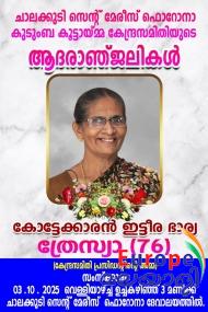 ഗ്ലോസ്റ്ററില് താമസിക്കുന്ന ജോബി ഇട്ടിരയുടെ മാതാവും ഇട്ടിര കോട്ടേക്കാരന്റെ ഭാര്യയുമായ ത്രേസ്യാ (76) നിര്യാതയായി.