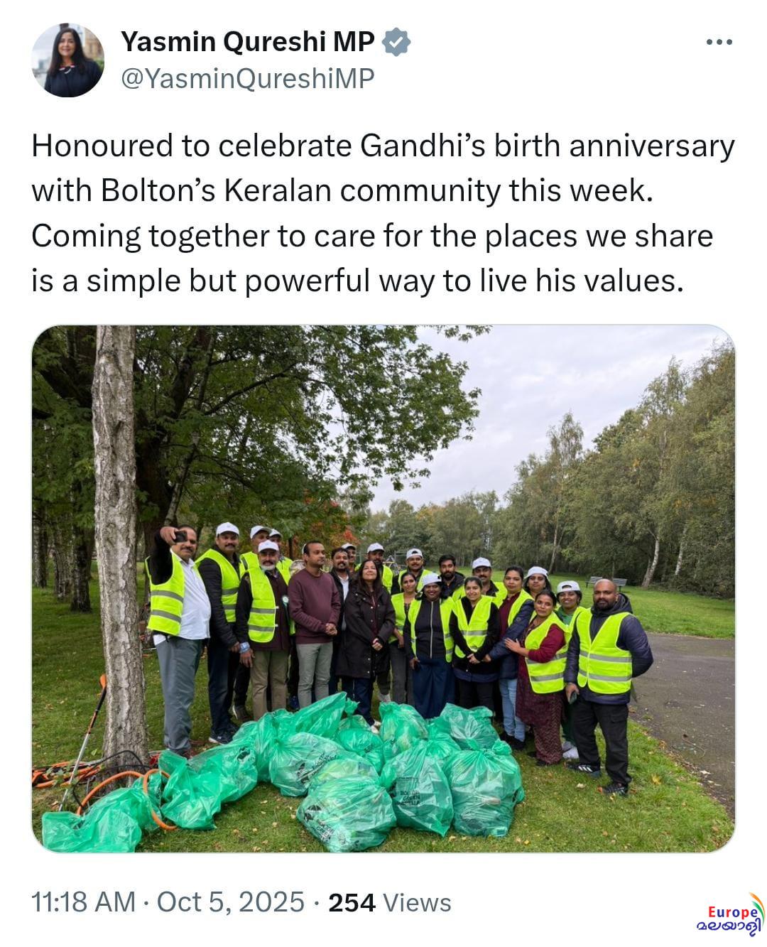 ബോള്ട്ടന്: ഗാന്ധിജയന്തി ദിനത്തില് ബോള്ട്ടന് ചില്ഡ്രന്സ് പാര്ക്കില് ഐ ഓ സി (യു കെ) - കേരള ചാപ്റ്റര് മിഡ്ലാന്ഡ്സ് ഏരിയയുടെ ആഭിമുഖ്യത്തില് സംഘടിപ്പിച്ച തെരുവ് ശുചീകരണത്തില് പങ്കാളികളായ 22 വോളന്റിയര്മാര്ക്ക് ബോള്ട്ടന് കൗണ്സിലിന്റെ അഭിന്ദനം.