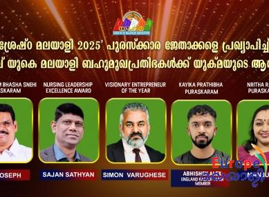 'യുക്മ ശ്രേഷ്ഠ മലയാളി 2025' പുരസ്കാര ജേതാക്കളെ പ്രഖ്യാപിച്ച് യുക്മ ദേശീയ നേതൃത്വം. ഭാഷ, ആരോഗ്യ പ്രവര്ത്തനം, ബിസിനസ്സ്, കായികം, കല എന്നിങ്ങനെ അഞ്ച് വ്യത്യസ്ത മേഖലകളില് കഴിവ് തെളിയിച്ചതിനോടൊപ്പം തികഞ്ഞ സാമൂഹിക പ്രതിബദ്ധതയോടെ യുകെ മലയാളി സമൂഹത്തിന് നല്കി വരുന്ന സേവനങ്ങളും പരിഗണിച്ചാണ് അവാര്ഡ് ജേതാക്കളെ തിരഞ്ഞെടുത്തതെന്ന് യുക്മ പ്രസിഡന്റ് അഡ്വ. എബി സെബാസ്റ്റ്യന്, ജനറല് സെക്രട്ടറി ജയകുമാര് നായര് എന്നിവര് അറിയിച്ചു. നവംബര് 22 ശനിയാഴ്ച പ്രിസ്റ്റണ് പാര്ക്ക് ഹാള് ഹോട്ടല് & സ്പായില് വച്ച് നടക്കുന്ന ചടങ്ങില് അവാര്ഡുകള് സമ്മാനിക്കും.