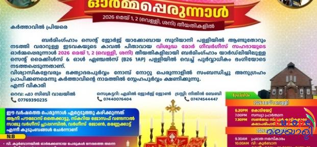 ഇംഗ്ലണ്ടിലെ പുതുപ്പള്ളിയില് വിശുദ്ധ ഗീവര്ഗീസ് സഹദായുടെ ഓര്മ്മ പെരുനാള് 2026 മെയ് മാസം 1 , 2 തീയതികളില്