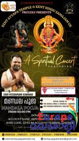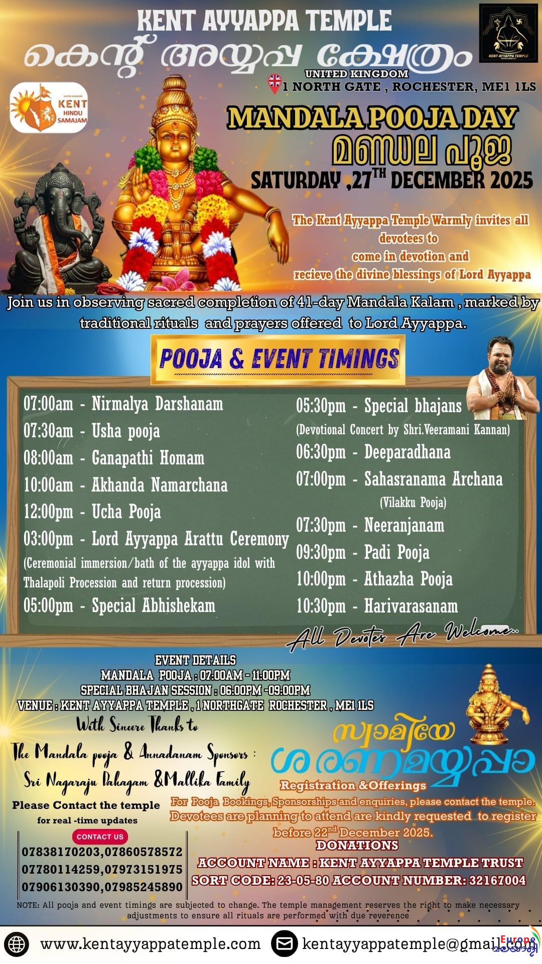ഇംഗ്ലണ്ടിലെ കെന്റ് അയ്യപ്പ ക്ഷേത്രത്തില് മണ്ഡല-മകരവിളക്ക് മഹോത്സവത്തോടനുബന്ധിച്ച് 2025 ഡിസംബര് 27 (ശനി) 41-ാം ദിവസ സമാപന വിളക്ക് ദിനം ഭക്തിസാന്ദ്രമായ ചടങ്ങുകളോടെ ആചരിക്കുന്നു. ഈ പ്രത്യേക ദിനത്തില് വിശേഷ പൂജകളും പ്രത്യേക ഭജനയും നടത്തപ്പെടുന്നതാണ്.