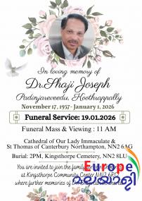 നോര്ത്താംപ്ടണിലെ മലയാളികളുടെ പ്രിയങ്കരനായിരുന്ന ഷാജി ജോസഫ്, മികച്ച സാമൂഹ്യ പ്രവര്ത്തകനും, സംഘാടകനുമായിരുന്നു.ഹോമിയോപ്പതിയില് ബിരുദധാരിയായ ഡോ. ഷാജി നാട്ടിലും യു കെ യിലുമായി ഹോമിയോ പ്രാക്റ്റിസ് നടത്തിയിരുന്നു.