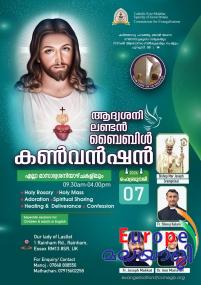 ലണ്ടനില് നടത്തപ്പെടുന്ന ആദ്യ ശനിയാഴ്ച്ച ബൈബിള് കണ്വെന്ഷന് തിരുക്കര്മ്മങ്ങളിലും ശുശ്രുഷകളിലും പങ്കുചേര്ന്ന് ആത്മീയ നവീകരണവും, സൗഖ്യ ശാന്തിയും, കൃപകളും മാതൃ മദ്ദ്യസ്ഥതയില് പ്രാപിക്കുവാന് ഏവരെയും സ്നേഹപൂര്വ്വം കണ്വെന്ഷനിലേക്ക് സ്വാഗതം ചെയ്യുന്നു.