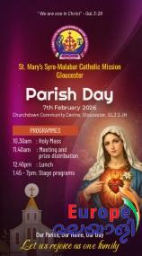 ഗ്ലോസ്റ്ററിലെ സീറോ മലബാര് കാതലിക് മിഷന്റെ പാരിഷ് ഡേ ശനിയാഴ്ച ചര്ച്ച് ഡൗണ് കമ്യൂണിറ്റി സെന്ററില് അതി ഗംഭീരമായി ആഘോഷിക്കുന്നു. വിശുദ്ധ കുര്ബാനയോടെ ആരംഭിക്കുന്നു. തുടര്ന്ന് നടത്തുന്ന പൊതു സമ്മേളനത്തില് വേദപാഠത്തില് ഉന്നത വിജയം നേടിയ കുട്ടികളേയും ബൈബിള് കലോത്സവത്തിലും മറ്റ് മത്സരങ്ങളിലും വിജയിച്ച ഏവരേയും ആദരിക്കും.