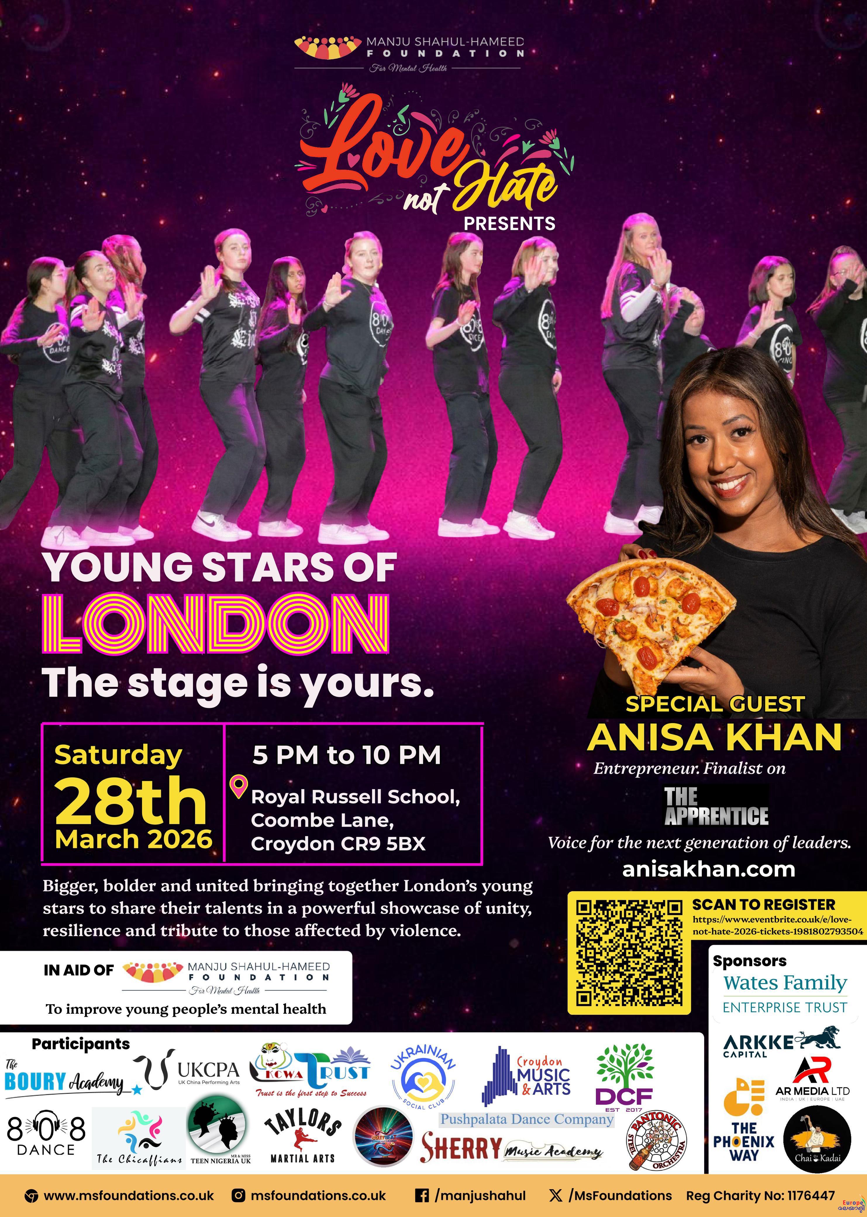 ലണ്ടന്: ക്രോയ്ഡണിലെ യുവജനങ്ങളുടെ വൈവിധ്യമാര്ന്ന കഴിവുകള് ആഘോഷിക്കുന്നതിനും അവര്ക്ക് ഐക്യദാര്ഢ്യം പ്രഖ്യാപിക്കുന്നതിനുമായി 'ലവ് നോട്ട് ഹേറ്റ്' (Love not Hate) എന്ന പേരില് ബൃഹത്തായ സാംസ്കാരിക പരിപാടി സംഘടിപ്പിക്കുന്നു.2026 മാര്ച്ച് 28 ശനിയാഴ്ച വൈകുന്നേരം 5 മണി മുതല് 10 മണി വരെ ക്രോയ്ഡണിലെ റോയല് റസ്സല് സ്കൂളിലാണ് (Royal Russell School) ചടങ്ങുകള് നടക്കുക.