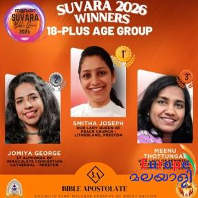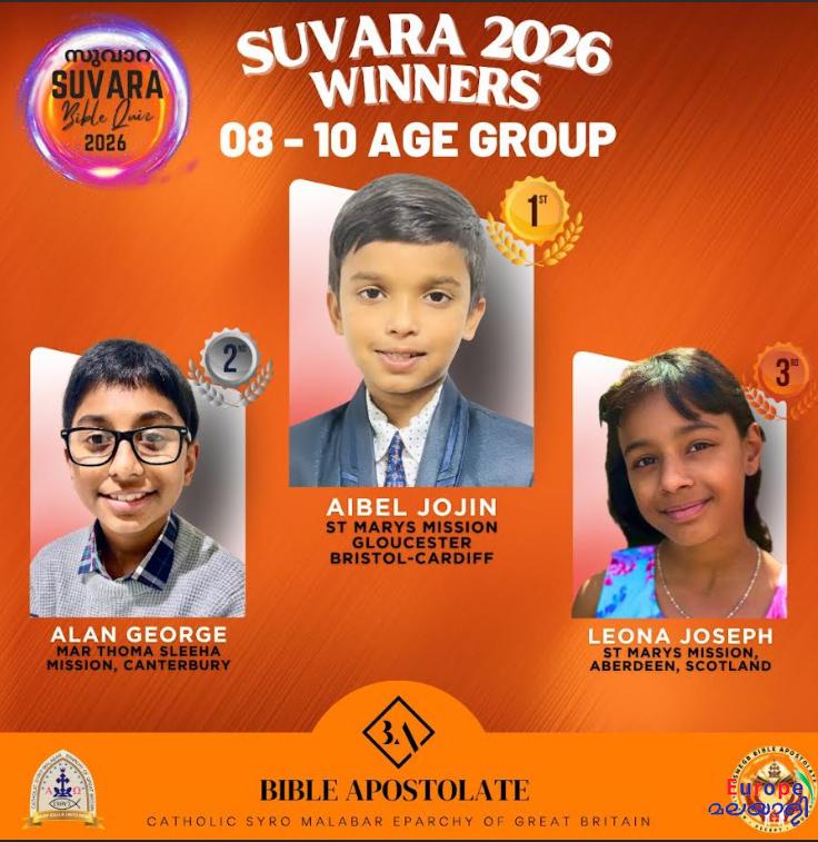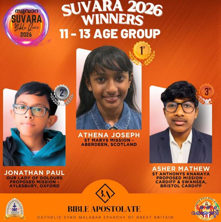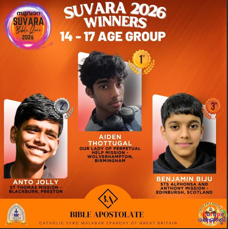 ലിവര്പൂള് .ഗ്രേറ്റ് ബ്രിട്ടന് സീറോ മലബാര് രൂപത സുവാറ ബൈബിള് ക്വിസ് 2026 ഫൈനല് മത്സരങ്ങള് ലിവര്പൂള് ലിതര്ലാന്ഡിലുള്ള ഔര് ലേഡി ക്വീന് ഓഫ് പീസ് സീറോ മലബാര് കാത്തലിക് പള്ളിയില് വച്ച് ഏപ്രില് 11 ന് നടന്നു . നാല് എയ്ജ് ഗ്രൂപ്പുകളിലായി നടത്തപ്പെട്ട ഓണ്ലൈന് മത്സരത്തില് രണ്ടായിരത്തിനാനൂറിലധികം മത്സരാര്ഥികളാണ് ഈ വര്ഷം പങ്കെടുത്തത് . വിവിധ റൗണ്ടുകളിലായി നടത്തപ്പെട്ട ഓണ്ലൈന് മത്സരങ്ങളില് നിന്നും ഏറ്റവും കൂടുതല് മാര്ക്കുകള് നേടിയ ഓരോ എയ്ജ് ഗ്രൂപ്പിലെയും ആറ് മത്സരാത്ഥികളാണ് ഫൈനല് മത്സരത്തില് മാറ്റുരച്ചത് . ഇഞ്ചോടിച്ചു പോരാട്ടത്തില് 8-10 എയ്ജ് ഗ്രൂപ്പിലെ മത്സരത്തില് ഒന്നാം സ്ഥാനം ഐബെല് ജോസ് ജോജിന്, സെന്റ് മേരീസ് മിഷന് ഗ്ലോസ്റ്റെര് ചെല്റ്റനാം ബ്രിസ്റ്റോള് കാര്ഡിഫ് റീജിയണും ,രണ്ടാം സ്ഥാനം അലന് ജോര്ജ് മാര് തോമാ മിഷന് കാറ്റര്ബറി കാന്റര്ബറി റീജിയനും, മൂന്നാം സ്ഥാനം ലിയോണ ജോസഫ് സെന്റ് മേരീസ് മിഷന് അബെര്ഡീന് സ്കോട്ലന്ഡ് റീജിയണും നേടി . ഈ എയ്ജ് ഗ്രൂപ്പ് മത്സരങ്ങള്ക്ക് ക്വിസ് മാസ്റ്റര് റിയ ഷാജു നേതൃത്വം കൊടുത്തു .