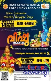 കെന്റ് അയ്യപ്പ ടെമ്പിളും കെന്റ് ഹിന്ദുസമാജവും സംയുക്തമായി വിഷു ആഘോഷങ്ങളും, അയ്യപ്പ പൂജയും സംഘടിപ്പിക്കുന്നു. ഈ വരുന്ന ഏപ്രില് 14 ആം തീയതി തിങ്കളാഴ്ച രാവിലെ 10 മണി മുതല് 3 മണി വരെ വിഷു ആഘോഷങ്ങളും. വൈകുന്നേരം 5 മണി മുതല് 7 മണി വരെ അയ്യപ്പ പൂജയും ആണ് ചടങ്ങുകള്. അന്നേ ദിവസം വിഷു കണി, വിഷു കൈനീട്ടം, വിഷു സദ്യ, അയ്യപ്പ പൂജ എന്നിവഉണ്ടായിരിക്കുന്നതാണ്.