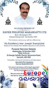 നോര്വിച്ച്: യു കെ യില് മക്കളെ സന്ദര്ശിക്കുവാനും, പേരക്കുട്ടികളുടെ ആഘോഷമായ ദിവ്യകാരുണ്യ സ്വീകരണത്തിലും, ജ്ഞാനസ്നാനത്തിലും പങ്കുചേരുവാനുമായി നാട്ടില് നിന്നെത്തിയ വേളയില്, ഹൃദായാഘാതം മൂലം നിര്യാതനായ സേവ്യര് ഫിലിപ്പോസ് മരങ്ങാട്ടിന് (അപ്പച്ചന്കുട്ടി 73) നോര്വിച്ചില് അന്ത്യവിശ്രമം ഒരുക്കുന്നു.