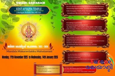 കെന്റ് അയ്യപ്പ ക്ഷേത്രത്തില് 2025 നവംബര് 17 തിങ്കളാഴ്ച മുതല് 2026 ജനുവരി 14 ബുധനാഴ്ച വരെ മണ്ഡല മകരവിളക്ക് ചിറപ്പ് മഹോത്സവം.